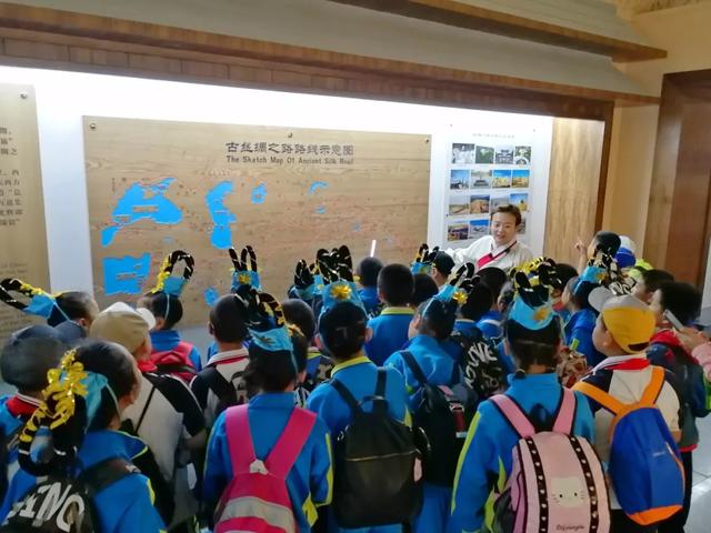 学生们紧紧围绕在讲解员的身边,认真聆听关于古丝绸之路上的知识。